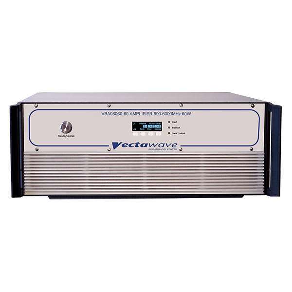 Vectawave’s VBA0860 Series covers 0.8–6 GHz with true Class-A linearity based on GaN wideband output stages and Vectawave’s quadrature-hybrid combiners. The result is low distortion, high reliability, and unconditional operation into severe mismatch—ideal for IEC/EN 61000-4-3 radiated immunity (stripline/small antennas), DO-160 §20 work, and demanding chamber applications.