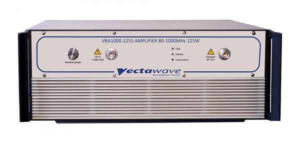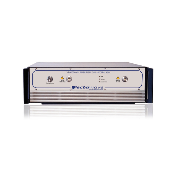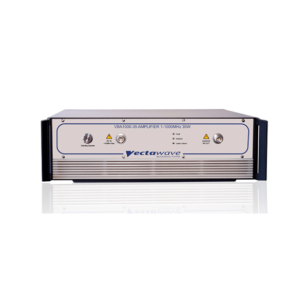 Vectawave’s VBA1000 Series covers 80–1000 MHz with true Class-A linearity using push-pull FET output stages (Silicon LDMOS or GaAs, model-dependent). The result is low distortion, high reliability, and tolerance of severe load mismatch—ideal for IEC/EN 61000-4-3 radiated immunity (stripline/small antennas), VHF/UHF fixture drive, and demanding chamber applications.