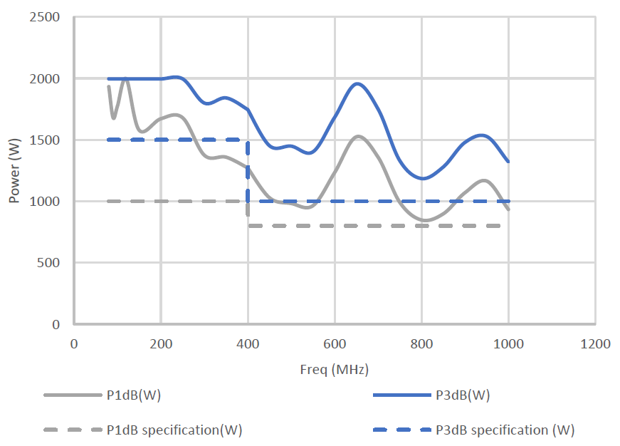 For immunity targets, size to P1 dB at the top frequency, with margin for fixture/antenna loss. For stripline/field work, ensure the amplifier can deliver the field with margin at 1 GHz.