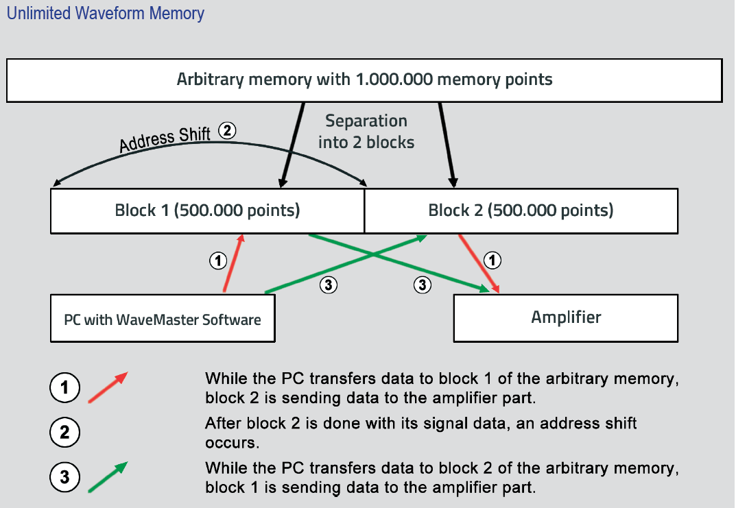 Unlimited Waveform Memory c::: This technology enables an endless, continuous data stream to the amplifier. c::: Compared to a function generator with its limited arbitrary memory there is no limitation of the size of the waveform. c::: A waveform with small spikes and interruptions of e.g. 100 µs and long constant levels in between can be simulated easily.