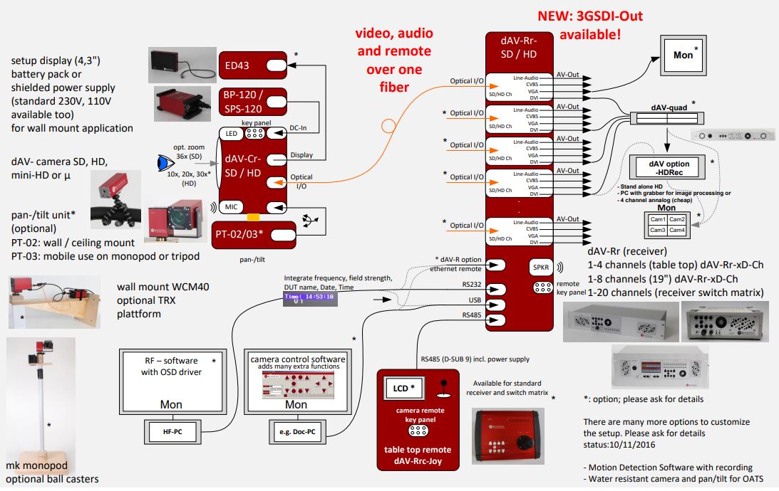 Applications:The dAV-cr-HD-mini Camera is designed for technical environments where real-time monitoring and detailed video analysis are critical. The smaller size allows it to easily fit into smaller areas. Its advanced functions allow for precise inspection of devices under test (DUTs), making it indispensable for EMC testing labs, product development facilities, and industrial monitoring tasks. Choose the dAV-cr-HD-mini Camera for unparalleled video clarity, advanced zoom performance, and professional-grade reliability. Contact Absolute EMC LLC today for more information and sales inquiries. Go to our quick guide for all mk messtechnik fiberoptic links A Quoted kit will consist of the following configuration: