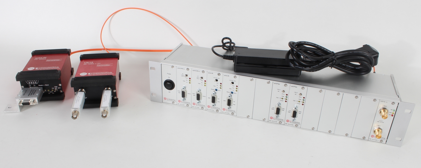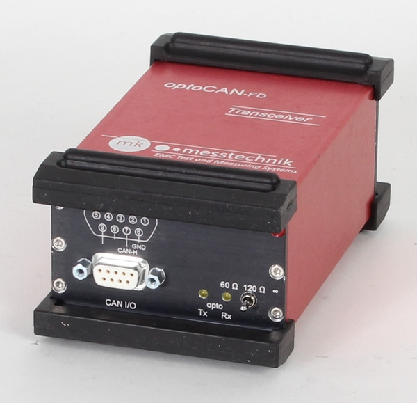 The optoCAN-LS system can be used for the bidirectional optical transmission of CAN optical transmitter for low speed-CAN signals with transmission rates of up to 125kbit/s. It consists of two identical battery supplied transceivers connected to each other with an optical fiber. With the optical transmission and the shielded case, the system is well equipped for EMI and EME tests.