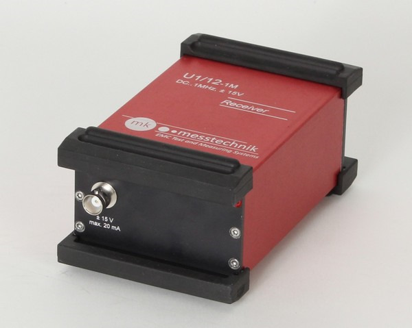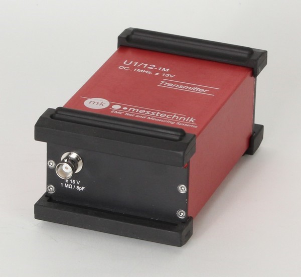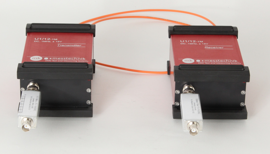 U1/8, 1 Channel, 50 MHz, Analog Fiber-optic linksThese measuring systems are used for the optical, digital transmission of analog signals with a resolution of 8 Bit and a maximal analog bandwidth of 50 MHz. They consist of a transmitter supplied by an external power supply, a plastic optical fiber, and a receiver – which also has an external power supply. Due to their insensitivity to strong electromagnetic fields above the specified transmission range, the systems are suitable for testing electromagnetic compatibility in EMC test chambers, TEM cells, and strip lines. The signal to be measured is filtered, sampled, digitized, and transmitted to the receiver via an optical transmitter system. At the receiver, the digital data stream is again converted into an analog signal and can be measured with a high-impedance probe (e.g., an oscilloscope) at the output. Go to our quick guide for all mk messtechnik fiberoptic links A Quoted kit will consist of the following configuration:U1/8-50M digital optical transmission of analog signals 1x U1/8-50M Transmitter
